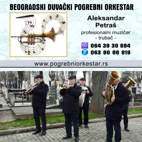 ” Muzika i veselje dočekuju čoveka pri rođenju, pesma ga prati kroz život i na kraju ona je opet tu da ga poslednja isprati. ” Vodeći se ovom mišlju, mi smo oformili naš duvački pogrebni orkestar koji možete pozvati da Vam pomogne u ispraćaju Vaše drage osobe. Naš orkestar, sastavljen je od profesionalnih školovanih muzičara koji dugi niz godina krajnje profesionalno obavljaju ovu delatnost na sahranama, opelima, kremacija, polaganjima urne, pomenima, ispraćajima… Nastupamo kao orkestar, ali i pojedinačno – truba, violina, crkveni hor – sve u zavisnosti od želje klijenata. U repertoaru koji sviramo nalaze se pogrebni marševi, starogradske pesme, romanse, romske pesme, sevdalinke, klasična muzika… Trudimo se svima da izađemo u susret onoliko koliko je u našoj moći,naravno da to bude sa ukusom uzimajući u obzir o kakvom događaju je reč. Aleksandar